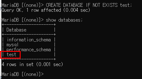 > CREATE DATABASE IF NOT EXISTS test;