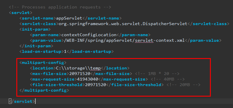 web.xml의 <servlet> 태그 내에는 <multipart-config> 태그를 추가합니다.