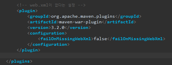 Java 설정을 이용하는 경우는 먼저 pom.xml에서 web.xml이 없어도 문제가 없도록 <plugin>을 추가합니다.