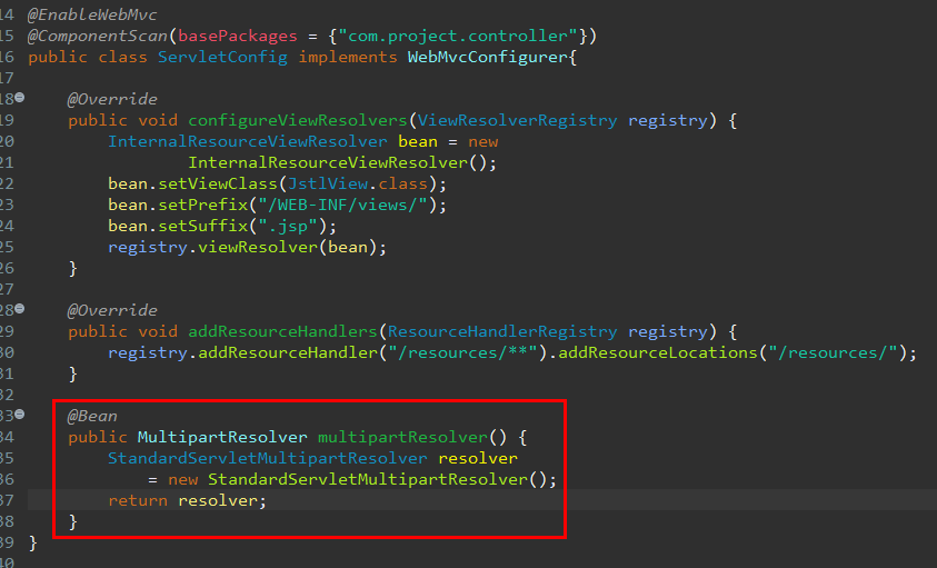 servlet-context.xml을 대신하는 ServletConfig 클래스 파일은 MutipartResolver를 스프링 빈으로 추가합니다.