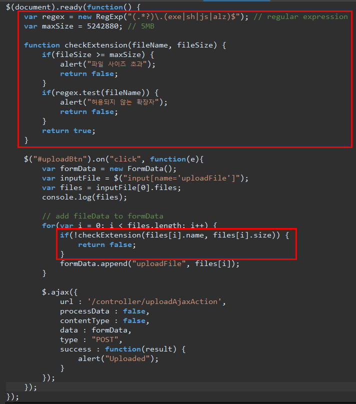 파일 확장자와 더불어 파일의 사이즈를 체크하고, 파일을 하나씩 추가하는 for문에서 각 파일을 검사합니다.