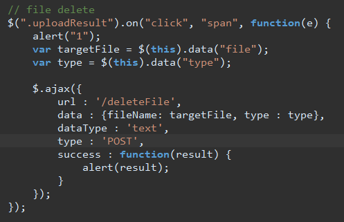 <span> 태그('X')를 클릭했을 때 파일이 삭제되도록 처리하는데, 파일 업로드 후 생성된 태그이기 때문에 '이벤트 위임' 방식으로 처리해야 합니다. 이벤트 처리는 Ajax를 이용해 첨부파일의 경로와 이름, 파일의 종류를 전송합니다.