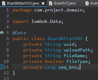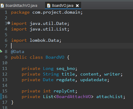 기존의 BoardVO는 등록 시 한 번에 BoardAttachVO를 처리하도록 List<BoardAttachVO>를 추가합니다.