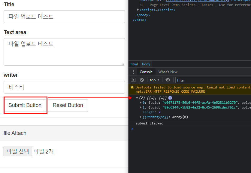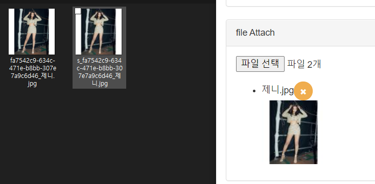 첨부된 파일 처리는 기존과 동일하지만 아직 썸네일이나 파일 아이콘을 보여주는 부분은 처리하지 않습니다. 브라우저의 콘솔 창과 파일 저장 디렉터리를 확인해서 파일 업로드가 정상적으로 처리되는지 만을 확인합니다.