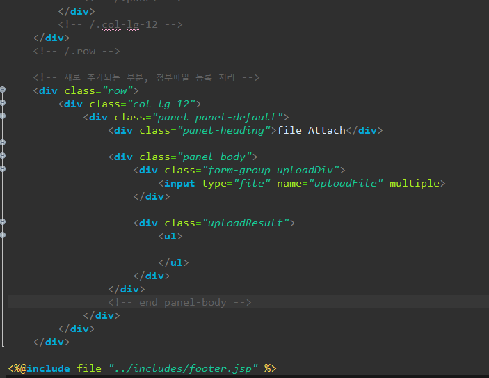 게시물 등록을 담당하는 /board/register.jsp 파일에서 첨부파일을 추가할 수 있도록 수정하는 작업부터 시작합니다.