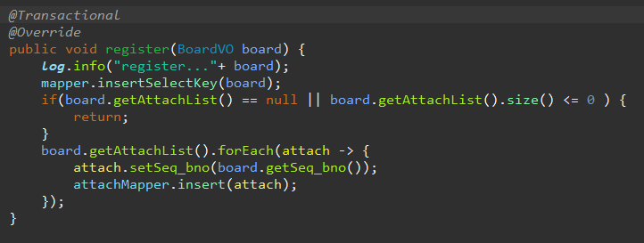 게시물의 등록 작업은 tb_board 테이블과 tb_attach 테이블 양쪽 모두 insert가 진행되어야 하기 때문에 트랜잭션 처리가 필요합니다.