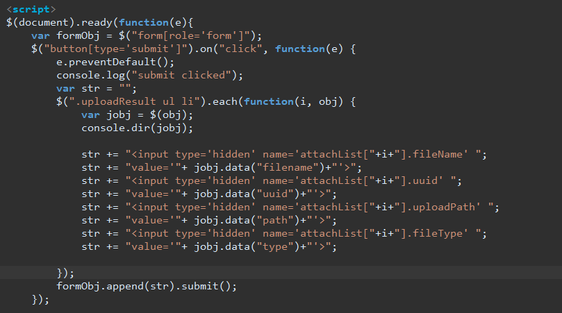 BoardVO에는 attachList라는 이름의 변수로 첨부파일의 정보를 수집하기 때문에 <input type='hidden'>의 name은 'attachList[인덱스번호]'와 같은 이름을 사용합니다.