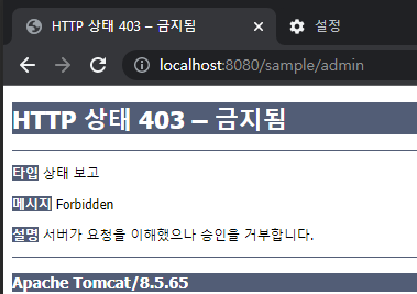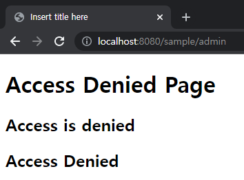 <security:access-denied-handler error-page="/accessError" /> 와 같이 error-page만을 제공하는 경우 위에서 본 바와 같이 URI 자체의 변화는 없습니다. 위 그림에서도 URI 자체는 '/sample/admin'으로 되어 있고, 화면의 내용은 '/accessError'에 해당하는 URI의 결과입니다.