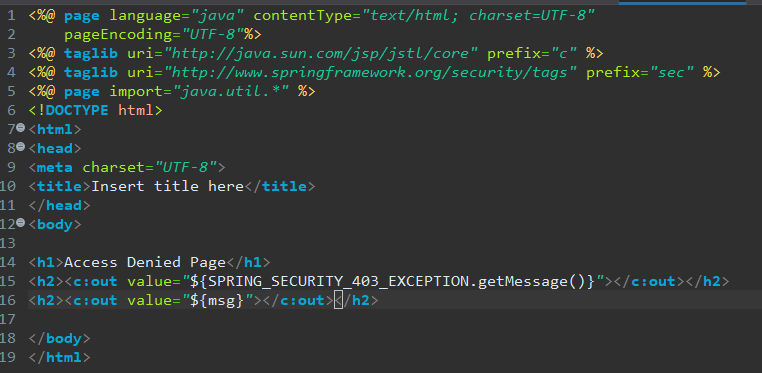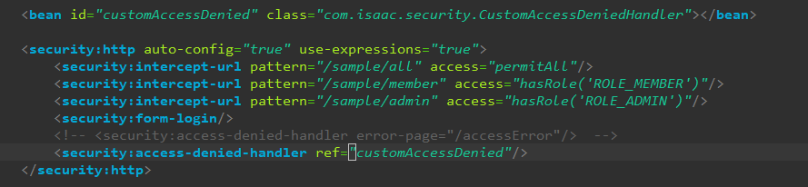 <security:access-denied-handler>는 org.springframework.security.web.access.AccessDeniedHandler 인터페이스의 구현체를 지정하거나 error-page를 지정할 수 있습니다. 위 경우 '/accessError'라는 URI로 접근 제한 시 보이는 화면을 처리합니다.