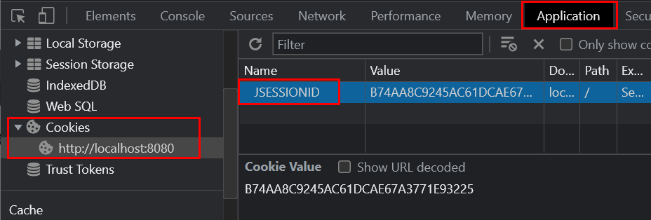 개발자 도구 > Application > Cookies 항목에 JSESSIONID(Tomcat에서 발행하는 쿠키 이름) 와 같이 세션을 유지하는데 사용되는 세션 쿠키의 존재를 확인할 수 있습니다.