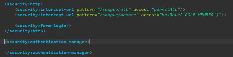 특정한 URI에 접근할 때 인터셉터를 이용해서 접근을 제한하는 설정은 <security:intercept-url>을 이용합니다. <security:intercept-url>은 pattern이라는 속성과 access라는 속성을 지정해야만 합니다. pattern 속성은 말 그대로 URI의 패턴을 의미하고, access의 경우는 권한을 체크합니다. 위 '/sample/member'라는 URI는 'ROLE_MEMBER'라는 권한이 있는 사용자만이 접근할 수 있습니다.