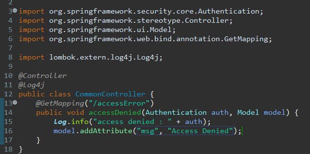 com.project.controller.CommonController 클래스를 생성해서 '/accessError'를 처리하도록 지정합니다.