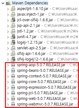 저장을 하게 되면 Maven Dependencies에 있는 스프링 프레임워크 라이브러리들이 변경됩니다.