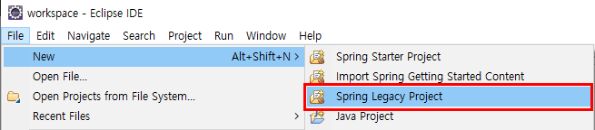 이전 시간에서 이클립스에 스프링 관련 플러그인을 추가했기 때문에 스프링 관련 추가 설정 없이 프로젝트를 생성할 수 있습니다. 프로젝트를 생성할 때 많은 분들이 Spring Legacy Project 로 생성합니다.