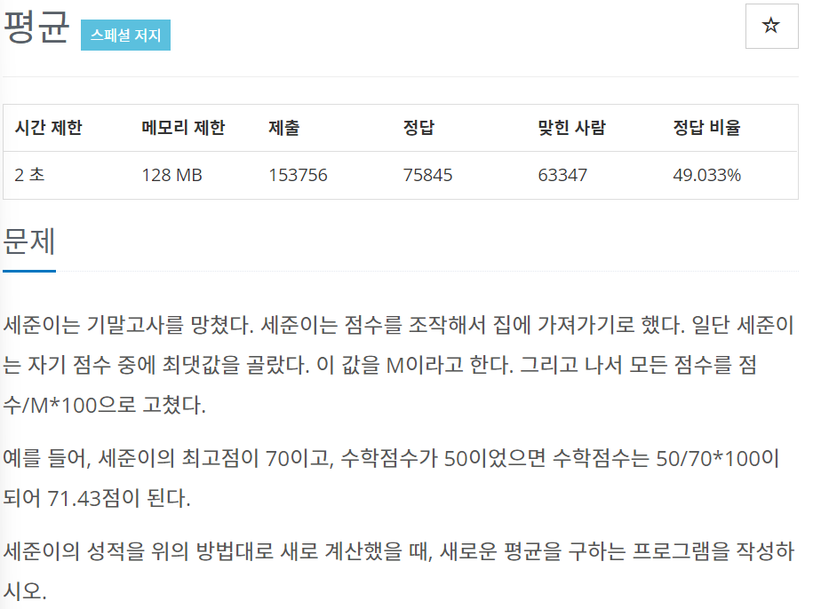 [Java] 백준 문제 1546 평균 백준 알고리즘 문제 푸는 사이트에서 문제를 갖고 왔다. (링크를 안 거는 이유는 링크의 주소가 달라졌을 때 글이 저품질이 걸릴 수 있다기에 걸지 않았다. 구글에서 백준 검색!) 다음은 입출력 조건이다. 여기까지 문제의 설명이다. 입출력 예제를 보고 답을 맞출 수 있도록 코드를 작성한다. 전체 소스 코드 import java.util.Arrays; import java.util.Scanner; public class Main { public static void main(String[] args) { Scanner sc = new Scanner(System.in); // 입력 int n = sc.nextInt(); double[] sco = new double[n]; ..