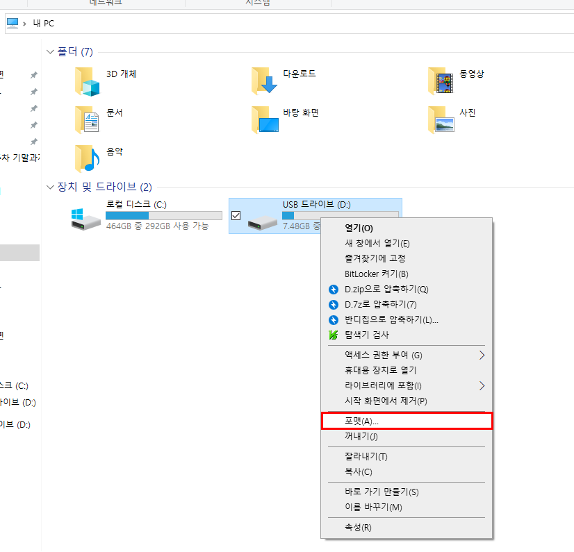 USB 포맷하기, 부팅용 USB만들기 위한 포맷 USB 포맷 방법은 다음과 같습니다. 1. USB삽입 후, 내 PC에서 나타난 [USB 드라이브]를 우클릭하여 [포맷(A)...] 을 실행합니다. 2. 파일 시스템을 [NTFS] 로 설정한 후, [시작(S)]버튼을 눌러 포맷을 시작합니다. NTFS에 대한 내용을 스크랩했습니다. 내용은 다음과 같습니다. [링크] https://support.microsoft.com/ko-kr/help/100108/overview-of-fat-hpfs-and-ntfs-file-systems https://support.microsoft.com/ko-kr/help/100108/overview-of-fat-hpfs-and-ntfs-file-systems 쿠키가 사용되고 있지 않습..