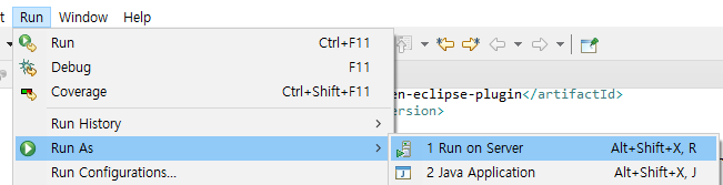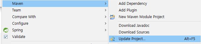 변경한 내용을 저장한 후, 프로젝트를 선택한 상태에서 'Maven > Update Project' 를 실행합니다.