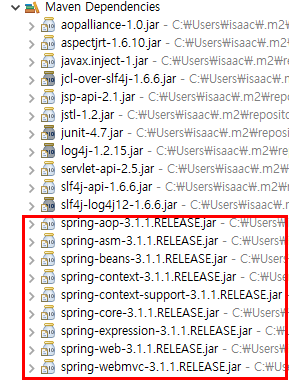저장을 하게 되면 Maven Dependencies에 있는 스프링 프레임워크 라이브러리들이 변경됩니다.