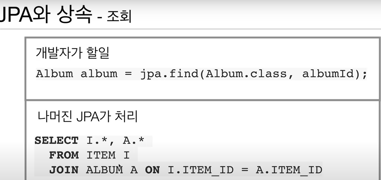 조회의 경우에도 상속으로 엮인 객체를 조회하기 위해 SELECT JOIN SQL을 작성해야 하는데, JPA가 이를 대신 작성한다.