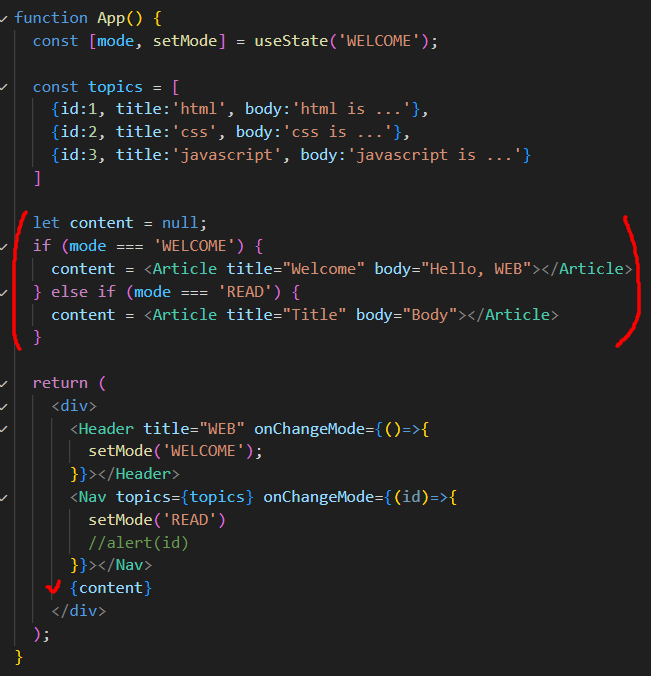 mode state에 따라서 content 변수에 Article 컴포넌트를 title 속성과 body 속성이 다른 값으로 할당하고,