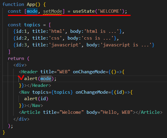 Header 컴포넌트의 onChangeMode 이벤트 함수에 alert() 인자로 mode를 넣어서