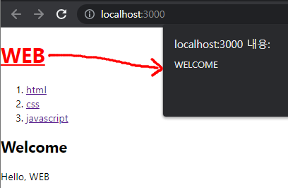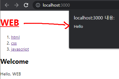 그럼 두 번 Header 제목을 클릭하면 alert 메시지가 'WELCOME'이 아닌 'Hello'를 띄우게 된다.