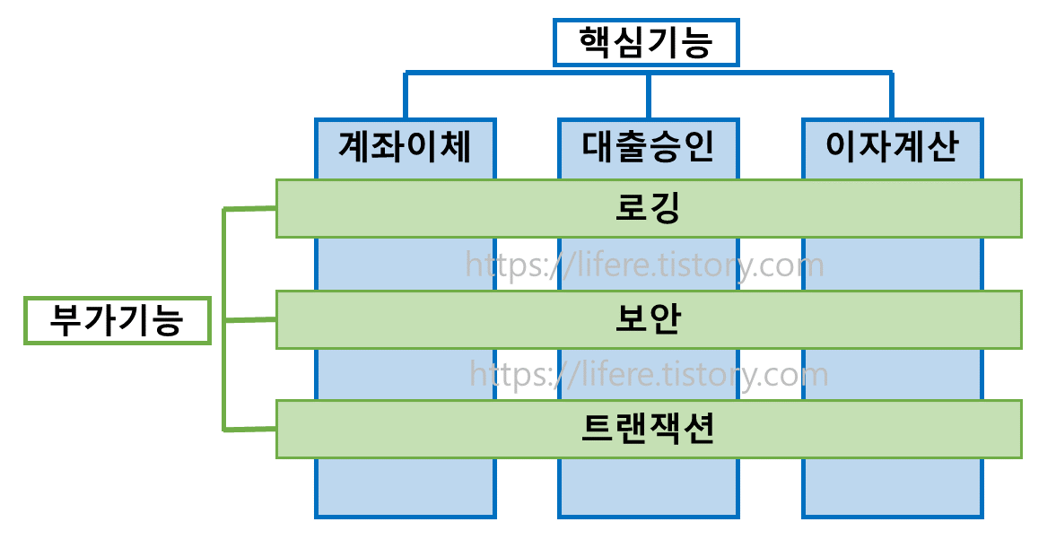 - 핵심기능을 도와주는 부가적인 기능(로깅, 보안 등)