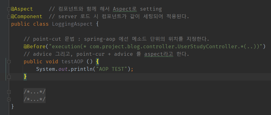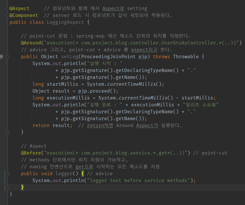 Aspect 대상 클래스의 Advice 메서드(setLog, logger)에 point-cut 문법으로 aop의 대상 메서드를 규정한다. point-cut에 설정된 위치(weaving 할 위치)의 메서드가 호출될 때 Aspect는 @Before, @Around과 같은 Advice 어노테이션을 기준으로 Aspect의 weaving 시점을 나타낸다. 실제 부가 기능으로는 Aspect의 어노테이션이 설정된 Advice 메서드(setLog, logger)가 동작하게 된다.