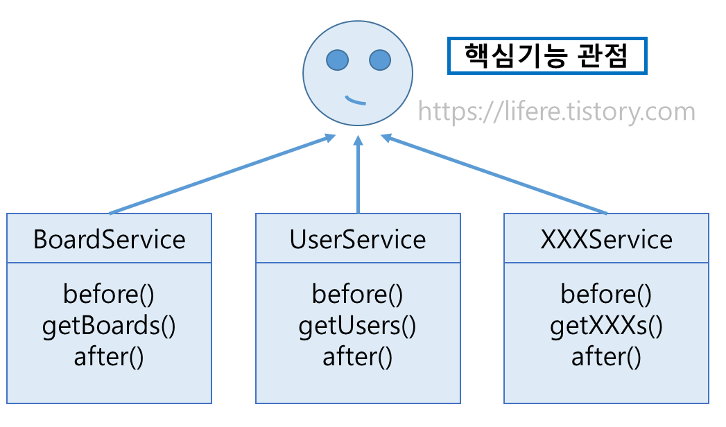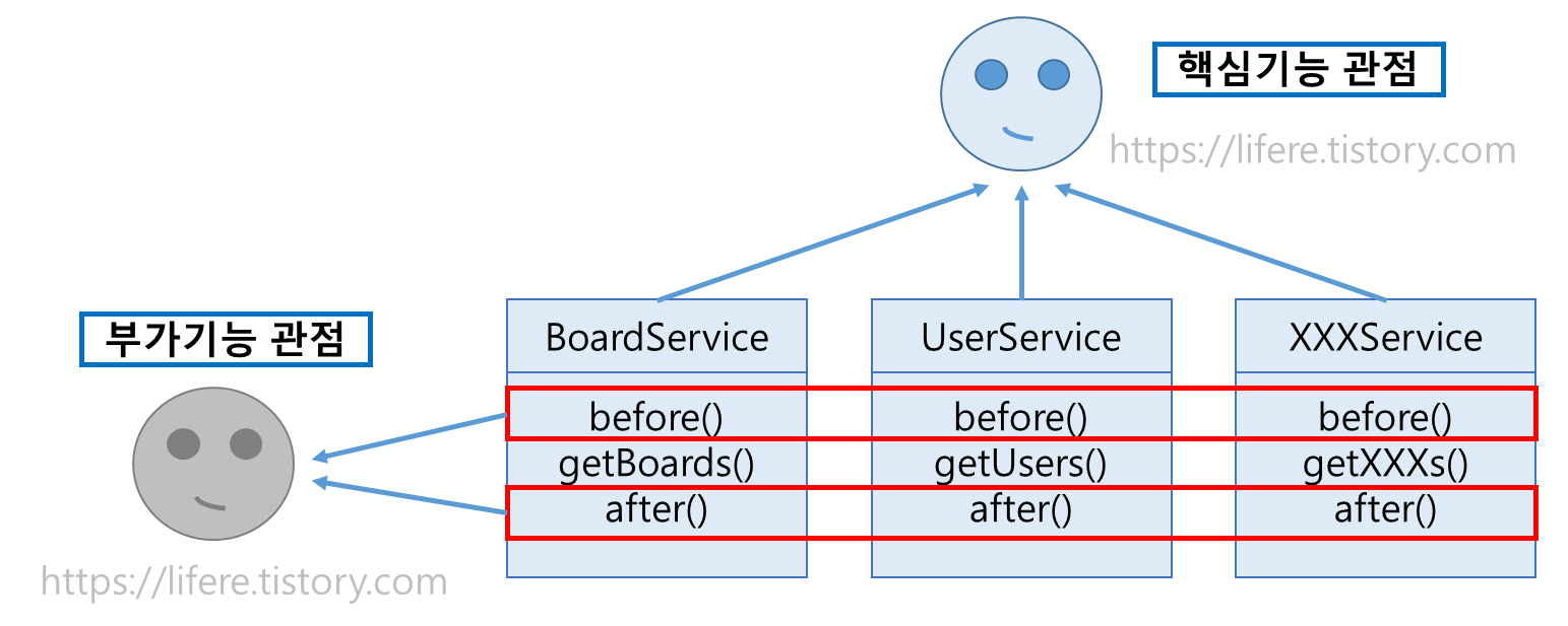 핵심기능 관점에서 봤을 때 부가기능은 게시판 대상 서비스의 getBoards() 메서드나 유저 대상 서비스의 getUsers() 메서드의 호출되는 시점 앞, 뒤로 before(), after()라는 공통 메서드를 사용해 부가기능을 처리하는 것이다. 이러한 before, after를 Cross-Cutting Concerns이라 할 수 있다.