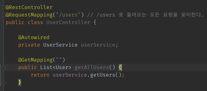 ■ 유저 정보를 다루는 Controller를 생성한다. UserController 클래스