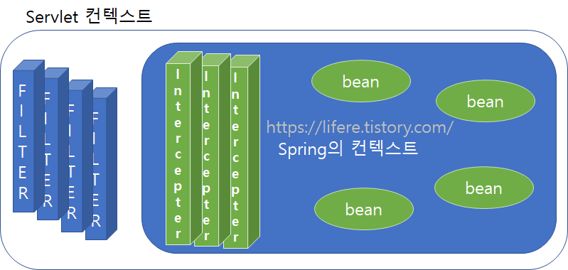 필터와 인터셉터는 특정한 서블릿이나 컨트롤러의 접근에 관여한다는 점에서 유사하지만 결정적인 차이를 구분하자면 필터는 스프링과 무관하게 서블릿 자원이고, 인터셉터는 스프링의 빈으로 관리되면서 스프링의 컨텍스트 내에 속한다는 차이입니다.