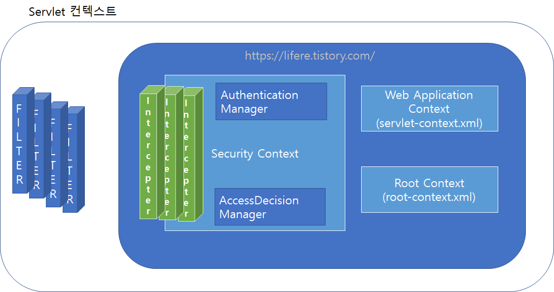 스프링 시큐리티를 이용하게 되면 인터셉터와 필터를 이용하면서 별도의 컨텍스트를 생성해서 처리합니다. 하나의 스프링 MVC 프로젝트에 스프링 시큐리티가 적용되면 다음과 같은 구조가 생성됩니다.