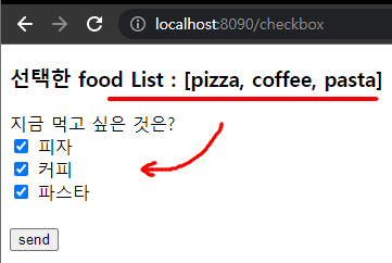 Post에서 볼 부분은 파라미터 부분으로 @RequestParam(value = "food")를 선언함으로써 form name 이 food 인 것들의 값을 받을 준비를 한 것이고, 이를 List에 담습니다. 아무것도 선택하지 않은 경우에는 null값이 들어오게 되는데, required = false를 해줌으로써 null 값이 와도 필수처리를 하지 않기 때문에 오류를 발생하지 않을 수 있습니다.