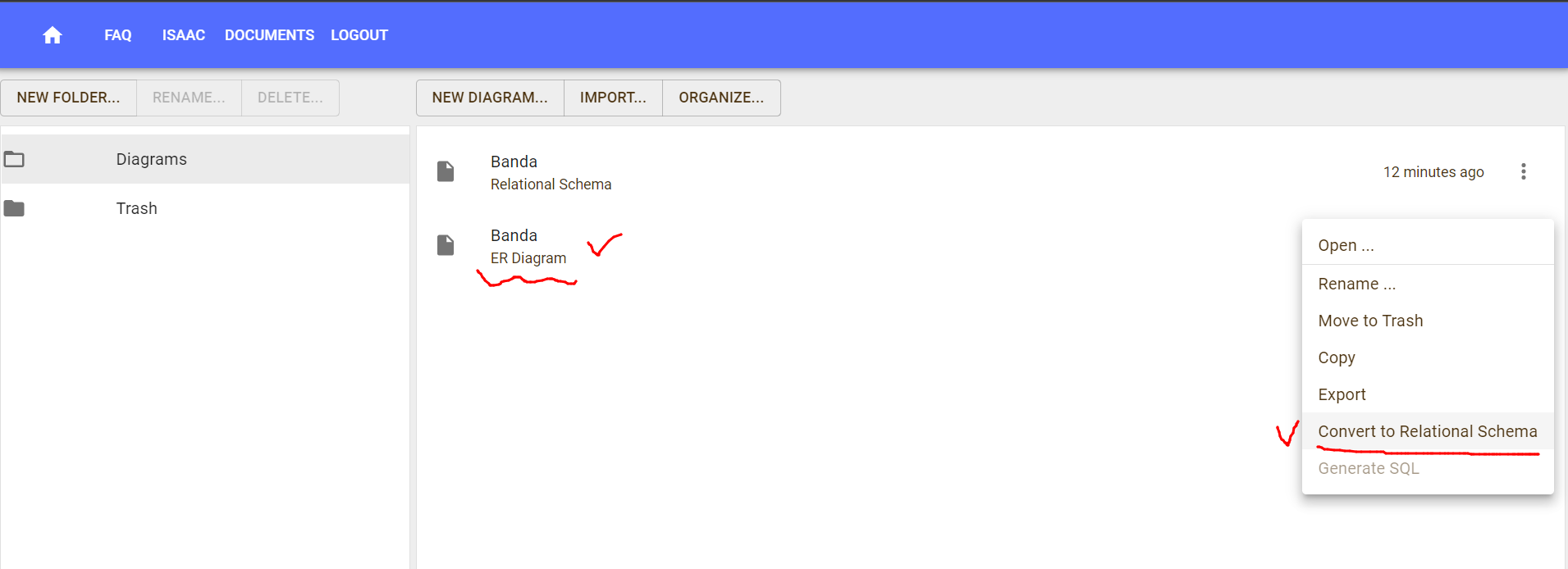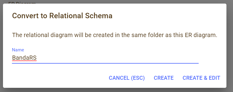 여기서 [Convert to Relational Schema]를 선택하면 관계 스키마, 관계 모델을 생성할 수 있습니다.