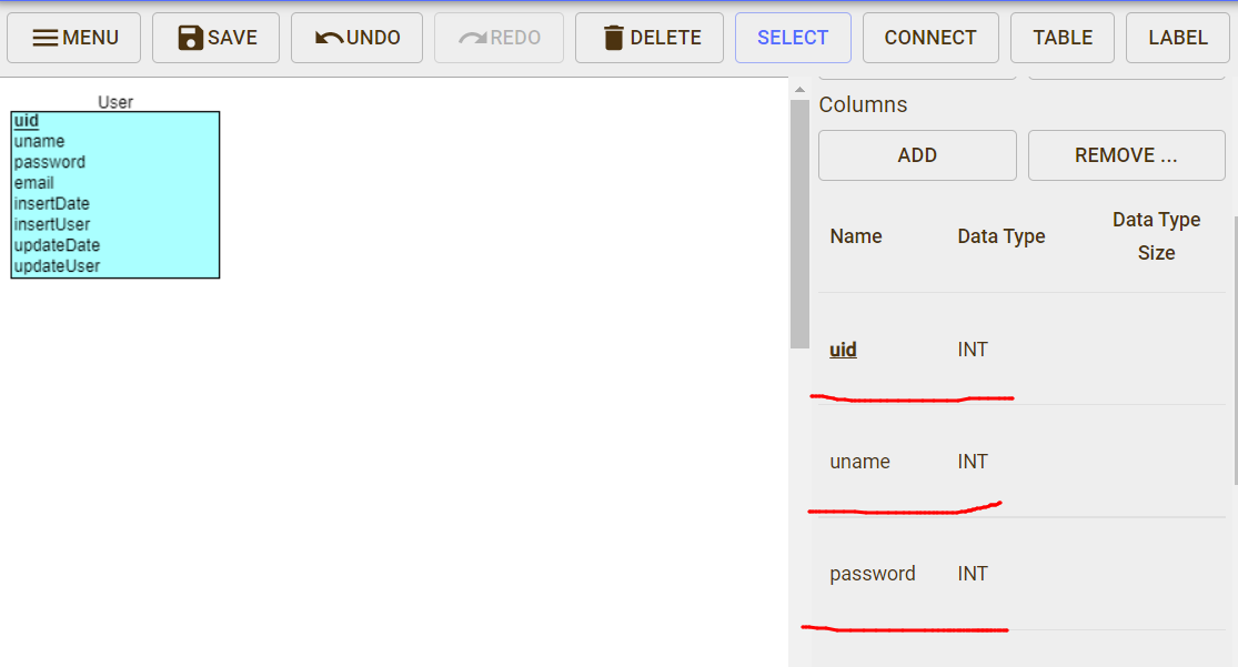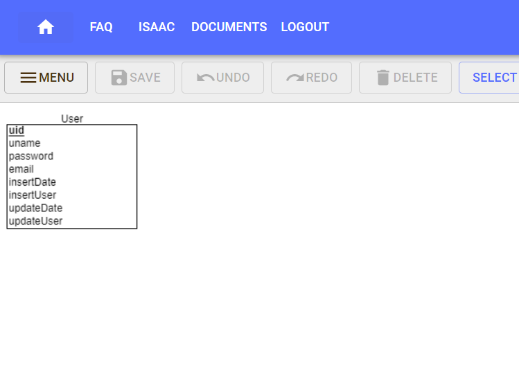 [개체/속성 삭제] 개체와 속성을 드래그 한 다음 위 [DELETE] 버튼을 클릭하면 생성한 개체와 속성이 삭제됩니다.
