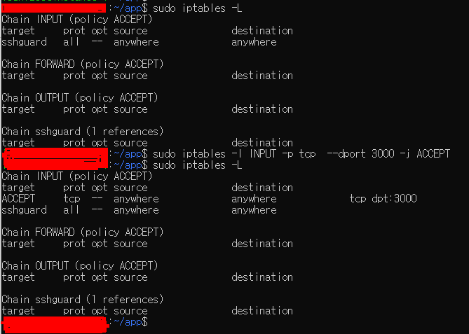 GCP VM 인스턴스의 linux에서 3000번 포트에 대해서 accept 합니다.