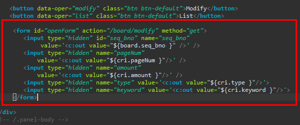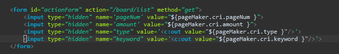 조회 페이지에서 수정/삭제 페이지로의 이동은 GET 방식을 통해 이동하고, <form> 태그를 이용하는 방식이므로 기존의 <form> 태그에 추가적인 type과 keyword 조건만을 추가합니다.