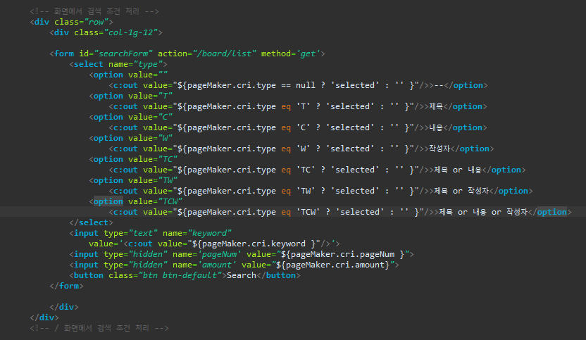 list.jsp에서는 검색 조건과 키워드가 들어 갈 수 있게 HTML을 수정해야 합니다. views 폴더 내의 list.jsp를 수정해서 페이지 번호 처리 바로 위에 검색 처리 내용을 추가합니다.