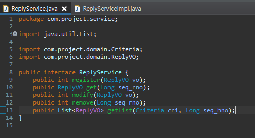 [Spring] 댓글 처리, 서비스(Service) 영역과 Controller 처리 (feat. @RestController) 이전 글 2021.08.01 - [Spring] - [Spring] 댓글 처리를 위한 영속 속성 2021.07.31 - [Datebase/mariaDB, MySQL] - [MariaDB] 댓글 처리 테이블 : 외래 키에 대해 테이블 다뤄보기 2021.07.29 - [Spring] - [Spring] REST 방식 서비스 Service 이전 글의 댓글 처리를 위한 영속 속성 구성이 되었다고 보고, 서비스 영역을 작성합니다. com.project.service 패키지에 ReplyService 인터페이스와 ReplyServiceImpl 클래스를 작성합니다. ReplyService 인터..