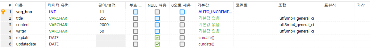 [Spring] 영속 계층의 CRUD 구현을 위한 환경설정 영속 계층의 작업은 항상 다음과 같은 순서로 진행합니다. 1. 테이블의 컬럼 구조를 반영하는 VO(Value Object) 클래스의 생성 2. MyBatis의 Mapper 인터페이스의 작성/XML 처리 3. 작성한 Mapper 인터페이스의 테스트 지난 글에 다음과 같은 구조로 테이블을 작성했습니다. 해당 테이블을 다시 사용하려고 합니다. https://lifere.tistory.com/130 [MariaDB] MariaDB 테이블 생성, 오토 시퀀스 (자동 값 증가) [MariaDB] MariaDB 테이블 생성, 오토 시퀀스 (자동 값 증가) 테이블 생성하기 CREATE TABLE tb_board ( seq_bno INT NOT NULL AUTO..
