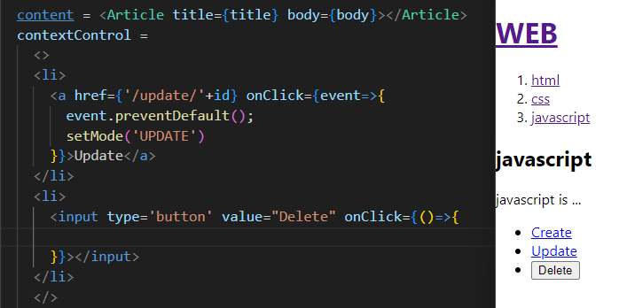 React App Delete 기능 구현하기 Create, Update에 이어서 마지막 Delete 기능을 구현해 보자. 일반적으로 Delete 버튼은 Update 버튼과 함께 있다. 게시판 상세 페이지에 수정, 삭제 버튼이 있듯이. 이전 글에서 mode state가 'READ'일 때 Update 버튼을 추가했다. 이전 글 2023.06.21 - [JS] - React App Update 기능 구현하기 mode state가 'READ'일 때, 즉 상세 페이지를 확인할 때 Update 버튼 아래에 'Delete' 버튼을 추가한다. 삭제 버튼의 기능을 추가한다. 삭제(Delete) 기능은 Create, Update와 비교하면 비교적 간단하다. 구현 방법은 다양하겠지만 위 코드는 다음과 같다. 빈 배열 new..