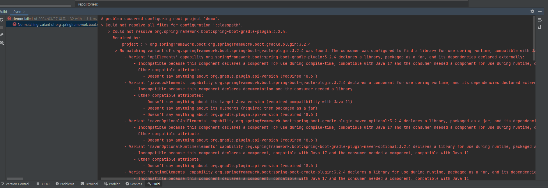 Spring boot 3.2.x version IntelliJ에서 실행 오류 해결 기존에는 항상 spring 2.x.x version으로 작업을 했다. 이번에 spring 3.2.4 version 으로 프로젝트를 만들어보려고 공식 홈페이지에서 프로젝트 다운로드 후 IntelliJ에서 실행해보았다. 시작하자마다 다음과 같은 오류가 발생했다. 일단 오류 메시지를 확인을 해보니 Java 17 이 사용되는 걸로 보이는 문구를 확인했다. Incompatible because this component declares a component for use during compile-time, compatible with Java 17 and the consumer needed a component for use du..