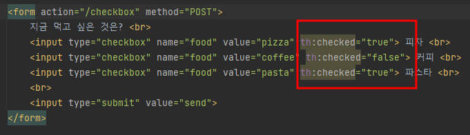 [Thymeleaf] checkbox, th:checked 타임리프에서 체크박스 데이터를 넘기는 방법에 대해 알아보겠습니다. 먼저 html 파일 상단에 타임리프 확장 링크 속성 추가해 주세요. th:checked 속성을 사용하여 체크박스에 체크 표시를 할 수 있습니다. th:checked의 값이 true 이면 html 파일에 checked 속성이 나타나고, false 이면 checked 속성이 없습니다. 다음으로 checkbox 데이터를 넘겨받고 처리하는 방법에 대해서 알아보겠습니다. html form에서 input name이 같은 checkbox의 값은 문자열 배열, 리스트로 값을 넘깁니다. Controller에서 Get, Post 요청을 처리하는 Method를 작성합니다. Post에서 볼 부분은 파라..